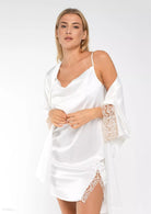 Samanta satin Kimino finished with delicate lace cuffs, this gown pairs perfectly with the Samanta Perla story.