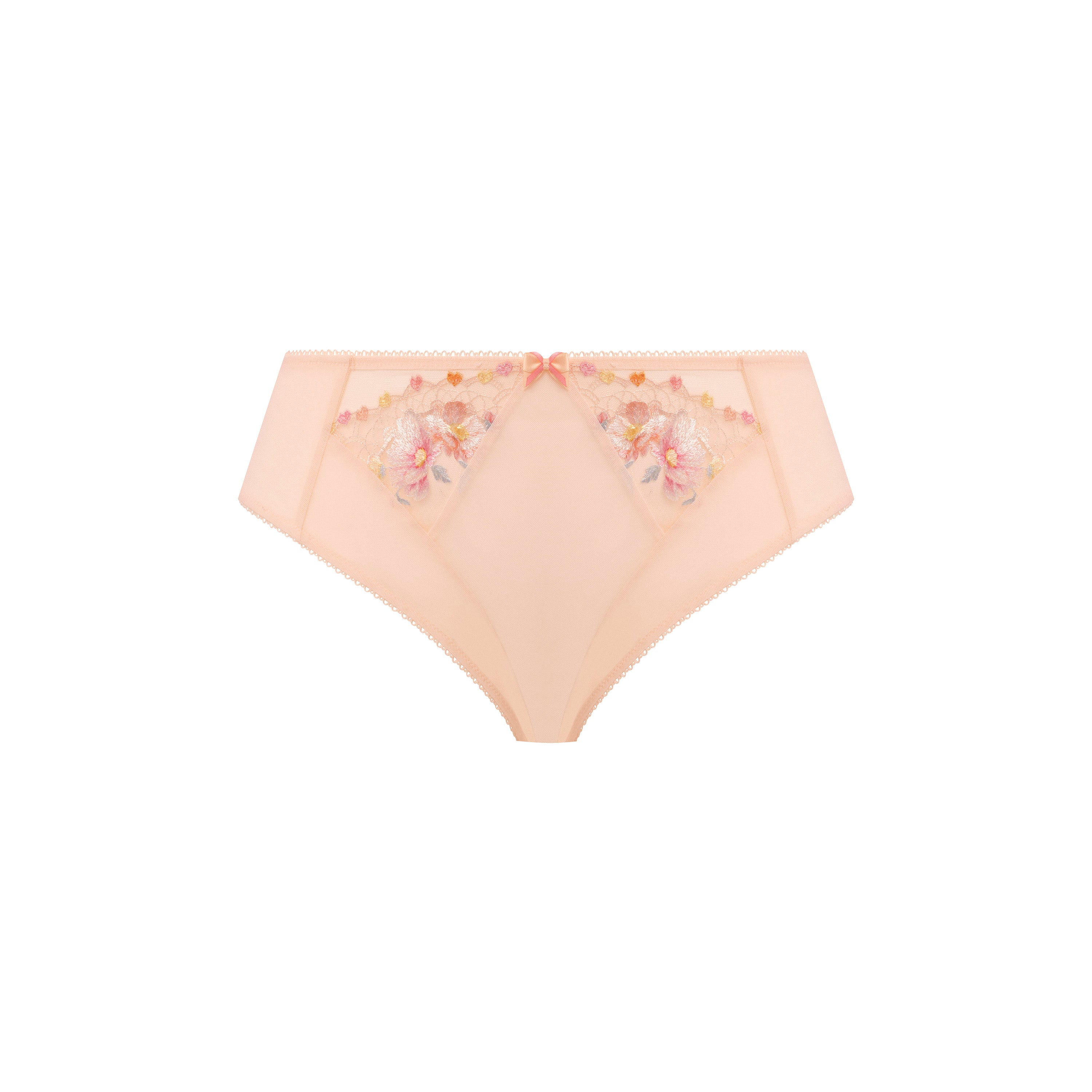 The Elomi Himari High Leg Brief Peach Whisper 10 is sure to steal the spotlight in SS24. With exquisite embroidery and cutting-edge print technology, the soft peach backdrop and cheerful floral and heart design make for a stunning 3-D effect. Complete the flattering silhouette with the Bra and stylish High Leg Brief.