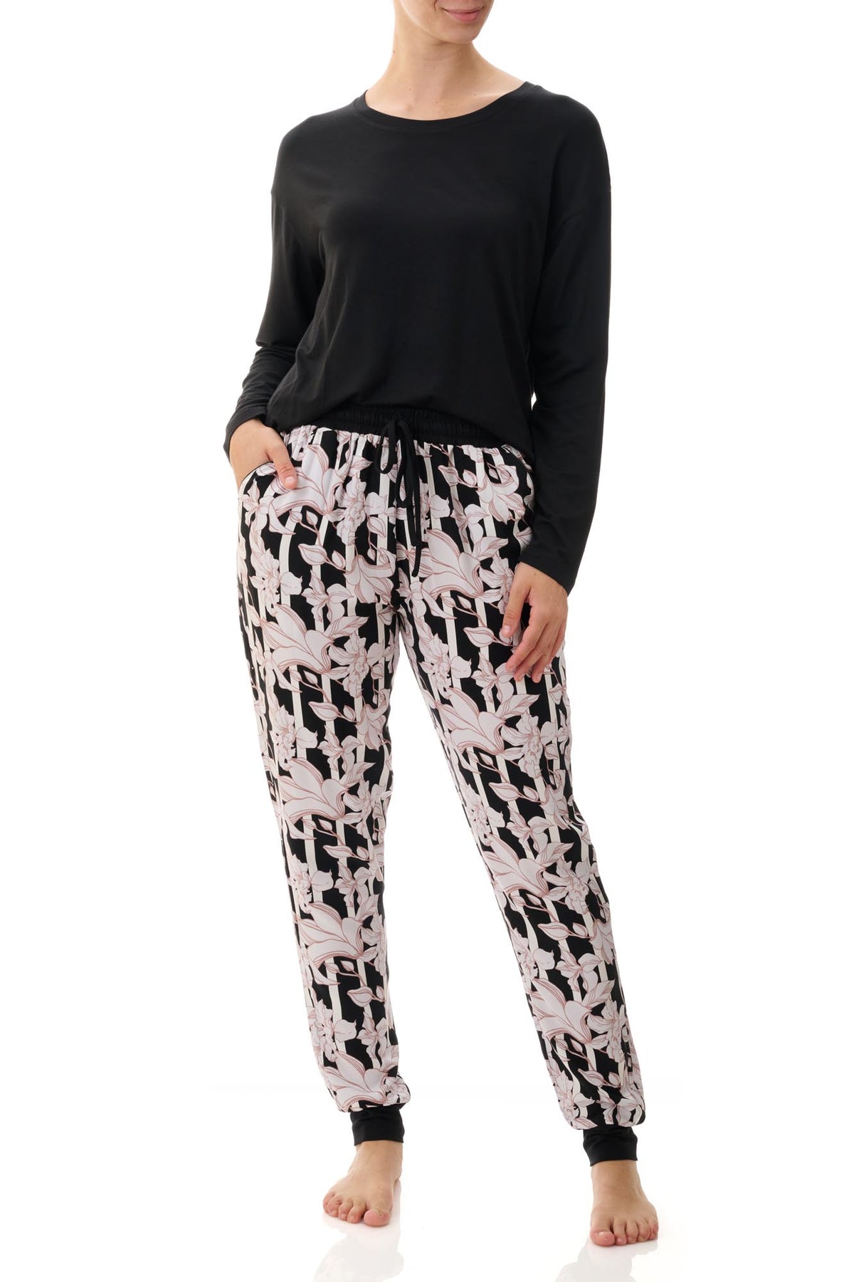 Exude sophistication with the Maya set, adorned with bold botanical prints over black and white chunky stripes. The ski PJ pant boasts a floral pattern with contrasting waistband, cuffs, and drawstring. Paired perfectly with a slinky black long sleeve top in a luxurious knit, creating a stylish and comfortable look.