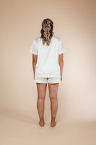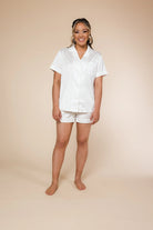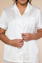 Unveil the essence of elegance with our pearl short satin Pj set. Designed to ensure the most memorable of moments, this set is epitome of luxury, sophistication and comfort. Soft, silky fabric and timeless pearl piping create an elegant aesthetic that totally embraces chic styling with feminine touch. These pyjamas are also perfect for brides.