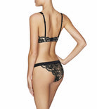 - Two-tone stretch lace galloon cups, with vintage floral design, are framed with cut-away satin cradle for a minimal and sensuously revealing silhouette